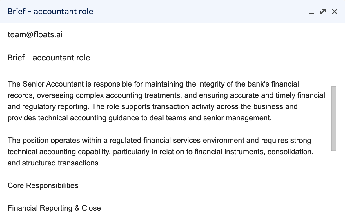 Paste in a job brief and let AI do the rest. Floats instantly generates a branded, professional job ad webpage that you can share with candidates via link — email, SMS, WhatsApp, LinkedIn and more.